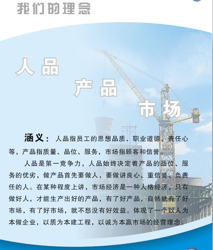 人品是第一競爭力,人品始終決定著產(chǎn)品的品位,服務的優(yōu)劣,做產(chǎn)品首先要做人,要做講良心、重信譽、負責任的人,在某種程度上講,市場經(jīng)濟是一種人格經(jīng)濟,只有做好人,才能生產(chǎn)出好的產(chǎn)品,有了好產(chǎn)品,自然就有了好市場,有了好市場,就不愁沒有好效益。體現(xiàn)了一個以人為本做企業(yè),以質(zhì)為本建工程,以誠為本贏市場的經(jīng)營理念。